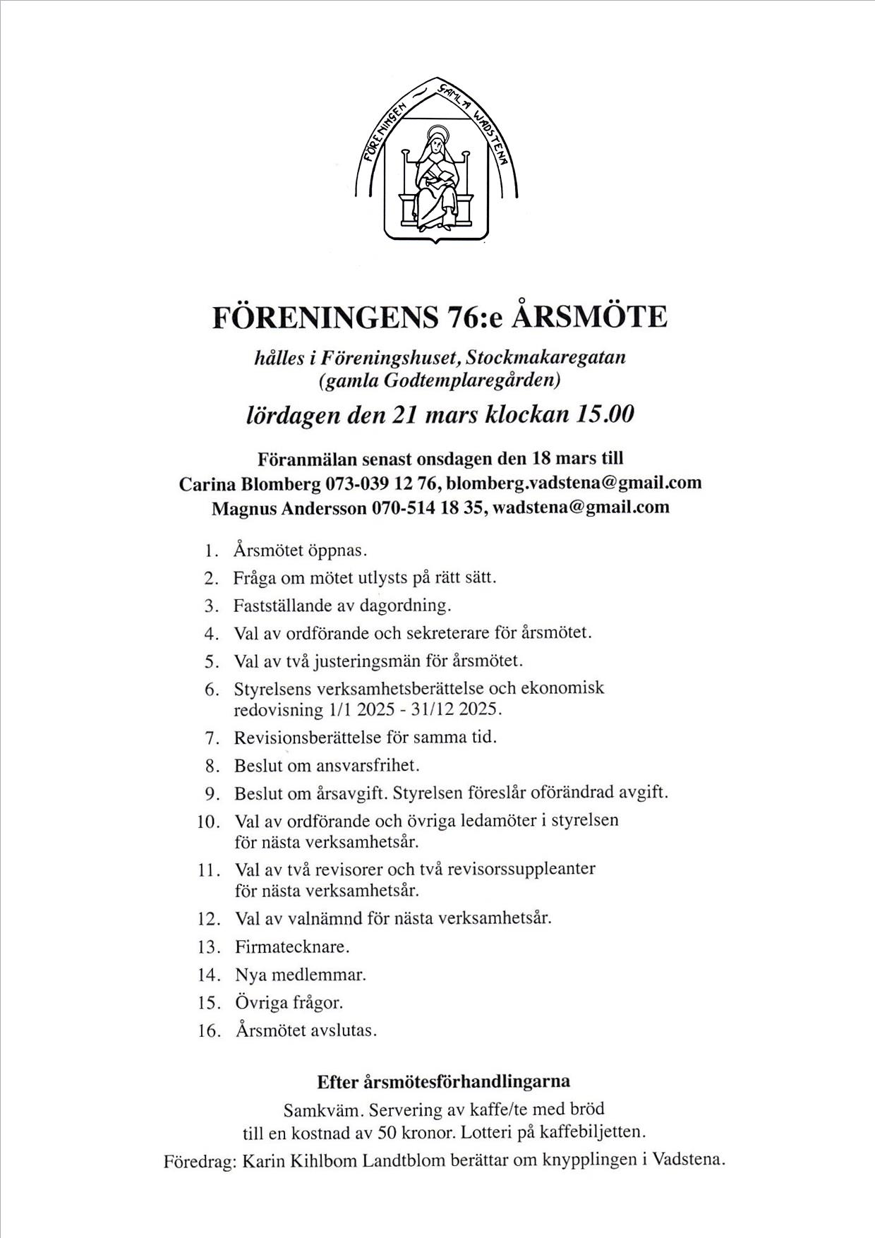 Välkommen till Föreningen Gamla Vadstenas höstmöte lördagen den 24 september klockan 15.00 på Godtemlaregården, Stockmakargatan.